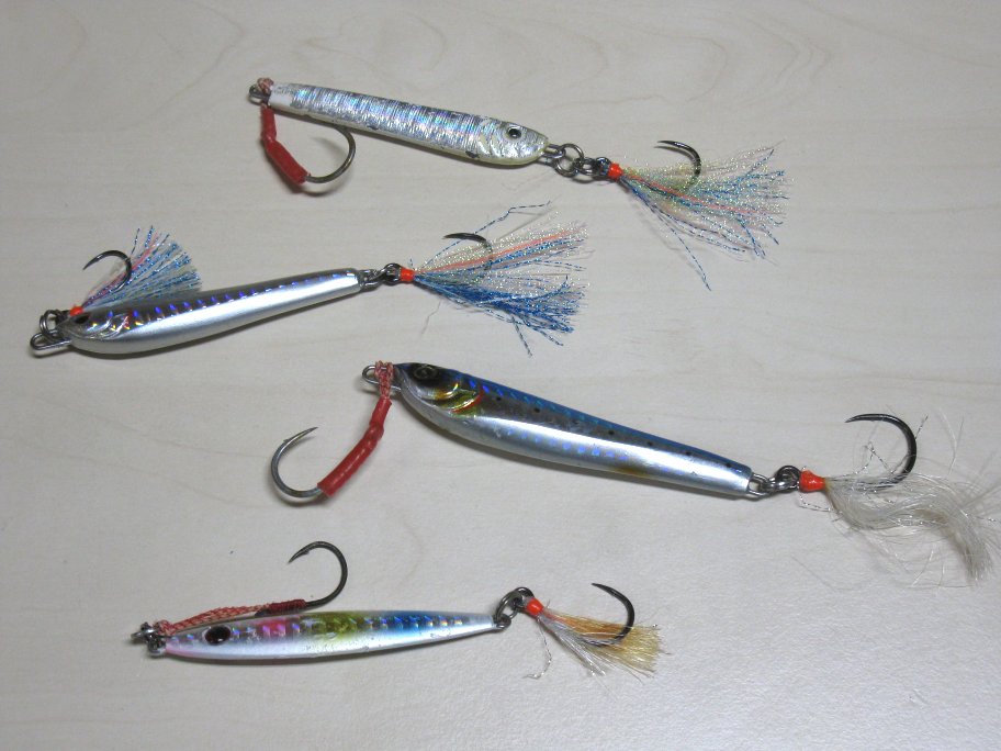 Hinsichtlich der Köder habe ich im Rahmen meines letzten Aufenthalts auf den Kanaren die besten Erfahrungen mit weißen, silbernen und blauen Shore Jigs (Küstenpilker) der Gewichtsklasse 25 bis 40g, in Ausnahmefällen bis 60g gemacht. Diese Köder sollten am hinteren Ende einen großen Einzelhaken (je nach Form Größe 2 bis 2/0) haben. Der Haken wird so montiert, dass die Hakenspitze beim Einziehen des