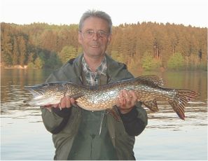 Im Hauptbecken beim Schleppen sowohl mit Wobbler als auch mit Köderfisch Hechte bis etwa 98cm Länge