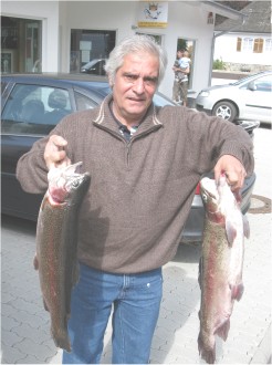 Ein seltener Doppelschlag beim Spinnfischen: 70cm (4kg) und 62cm (3kg) Regenbogenforellen vom 01.08.2009, Foto: H. de Koning, Fänger: F. Ruggiero